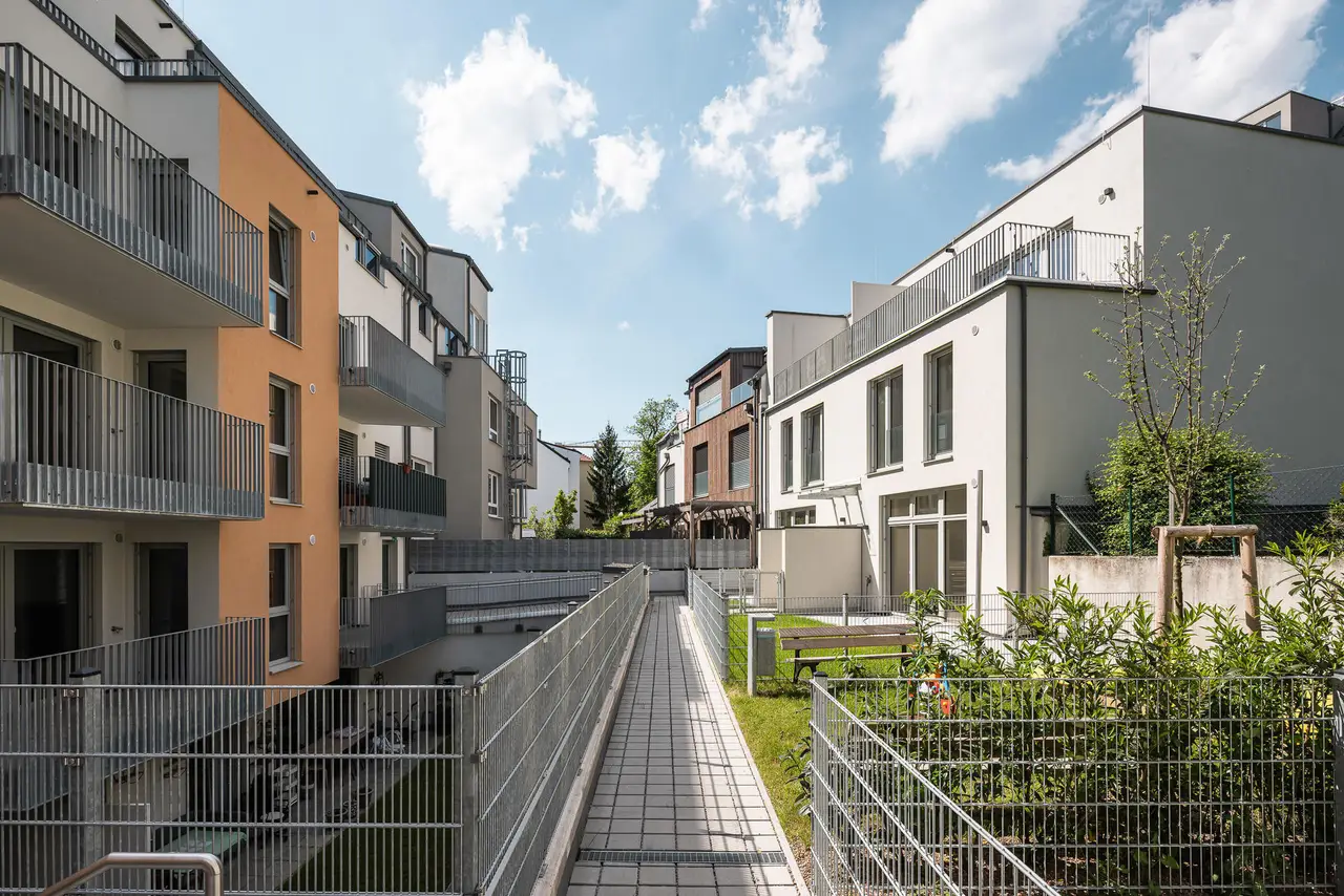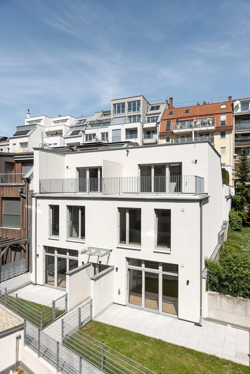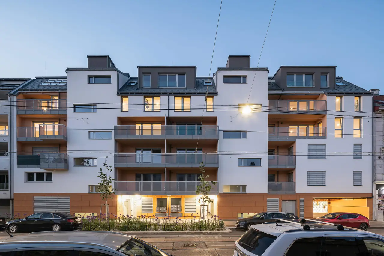 Ein straßenseitiges Wohngebäude mit 34 Wohnungen. Das Angebot wird den unterschiedlichsten Ansprüchen mehr als gerecht: geschmackvolle Ausstattung, die Verwendung von erstklassigen Materialien durchdachte Raumaufteilung und Parkettböden in den Wohnräumen. Sämtliche Wohnungen verfügen über attraktive Freiflächen wie Balkone oder Terrassen sowie nette Eigengärten im Erdgeschoß.
