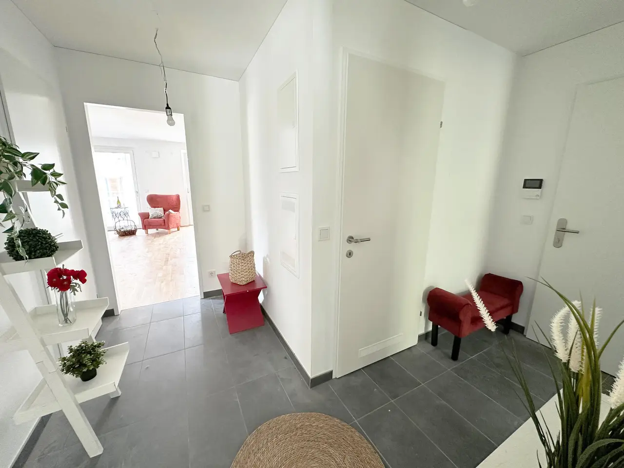 Zur Miete steht eine hochwertig ausgestattete, freifinanzierte 3-Zimmer-Wohnung im 1. OG. Die Wohnfläche beträgt ca. 75 m² und umfasst zusätzlich einen ca. 7 m² großen süd-westseitigen Balkon.
