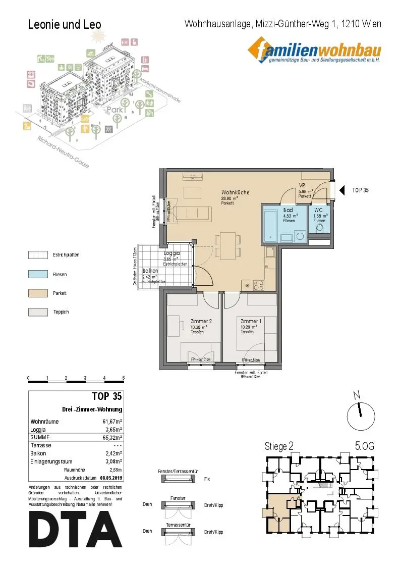 Zur WIEDERVERMIETUNG gelangt eine 65,32 m² große 3 – ZIMMER-WOHNUNG mit einer Loggia/Balkon im 5.OG im 21. Bezirk!