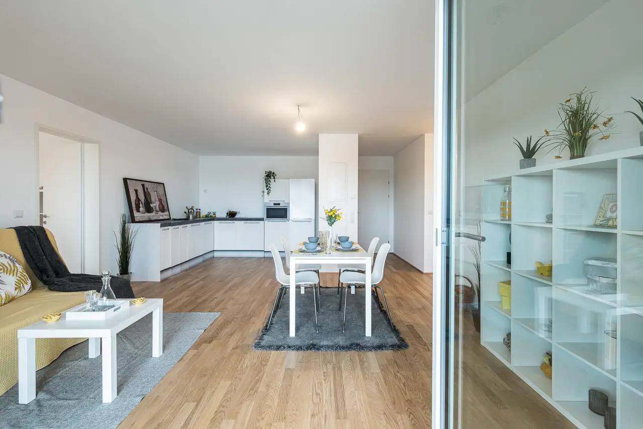 Es stehen wohnlich ausgestattete schlüsselfertige 2 bis 4 Zimmer-Wohnungen mit wohnlichen und praktischen Grundrissen in Größen von 51 m² bis 115 m² mit attraktiven Freiflächen wie Loggia, Balkon, Terrasse oder Eigengarten im Erdgeschoß zur Verfügung. Die jeweiligen Wohnetagen sind selbstverständlich barrierefrei mit dem Lift zu erreichen – ein Kinderwagen- und Fahrradabstellraum stehen ebenso zur Verfügung wie ein Kleinkinderspielplatz.